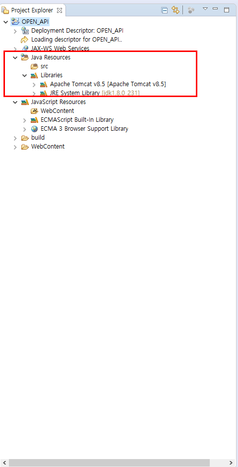 *Java Resources에 보면 설정한 Apache Tomcat 8.5와 JDK 1.8 정보 확인 가능 혹 처음 설정을 못하였다 하더라도