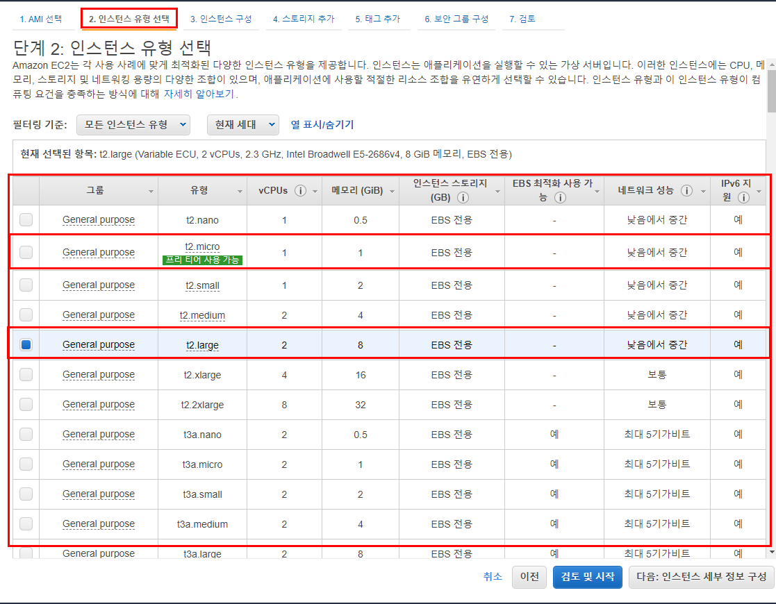 2번째 단계에서 인스턴스 유형을 선택할 수 있는데,